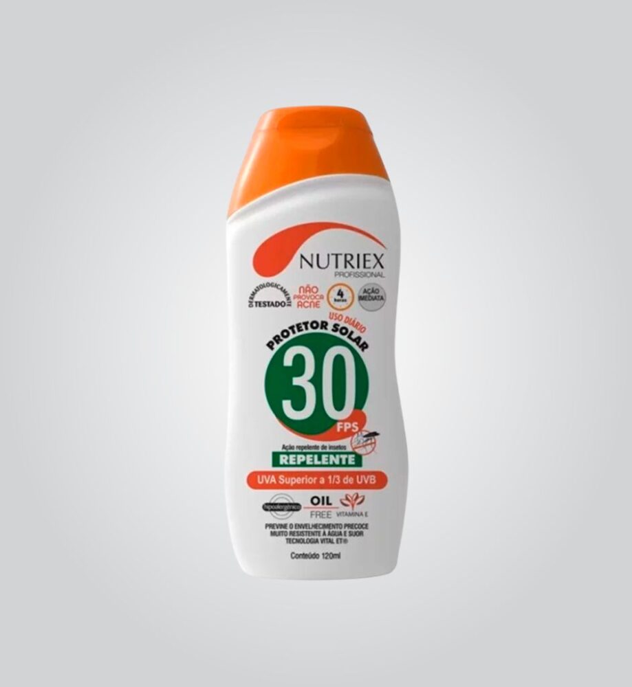 O protetor solar repelente profissional FPS 30 da Nutriex é ideal para proteção contra raios UVA e UVB. Oferece proteção máxima contra o sol e também os insetos. Protege contra o mosquito da dengue.