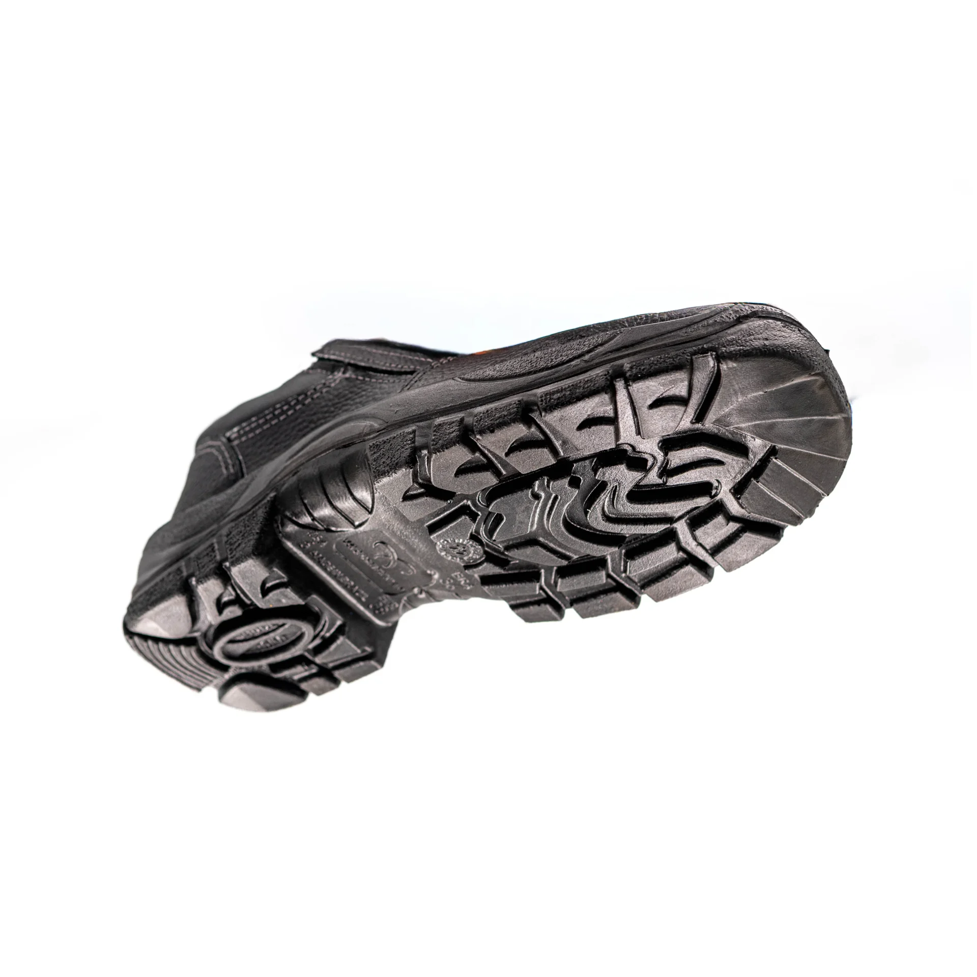 Calçado ocupacional isolante elétrico do tipo I, tipo botina, de uso profissional, fechamento em elástico preto nas laterais, confeccionado em couro preto curtido ao cromo, gáspea e forro em material têxtil, palmilha de limpeza em não tecido, sem biqueira de aço, solado de poliuretano bidensidade injetado diretamente no cabedal.